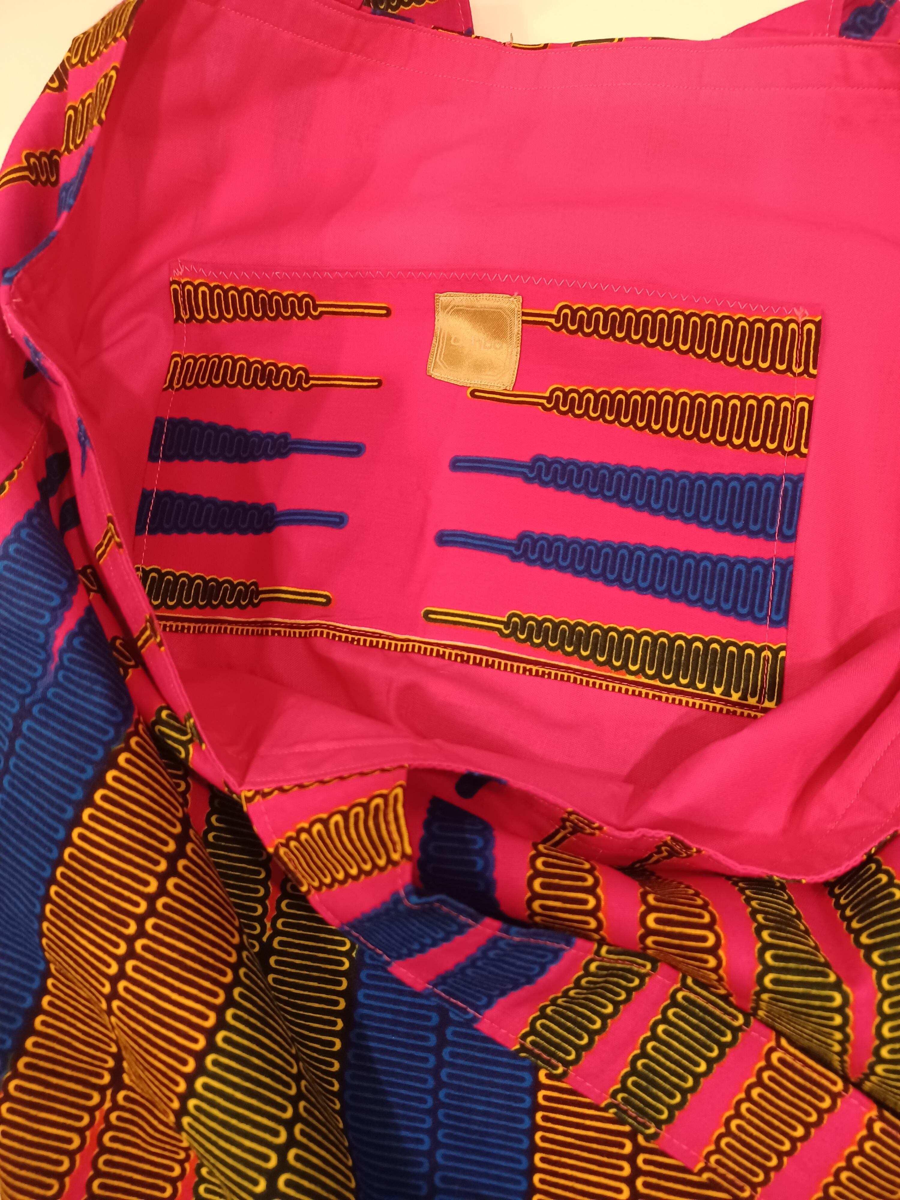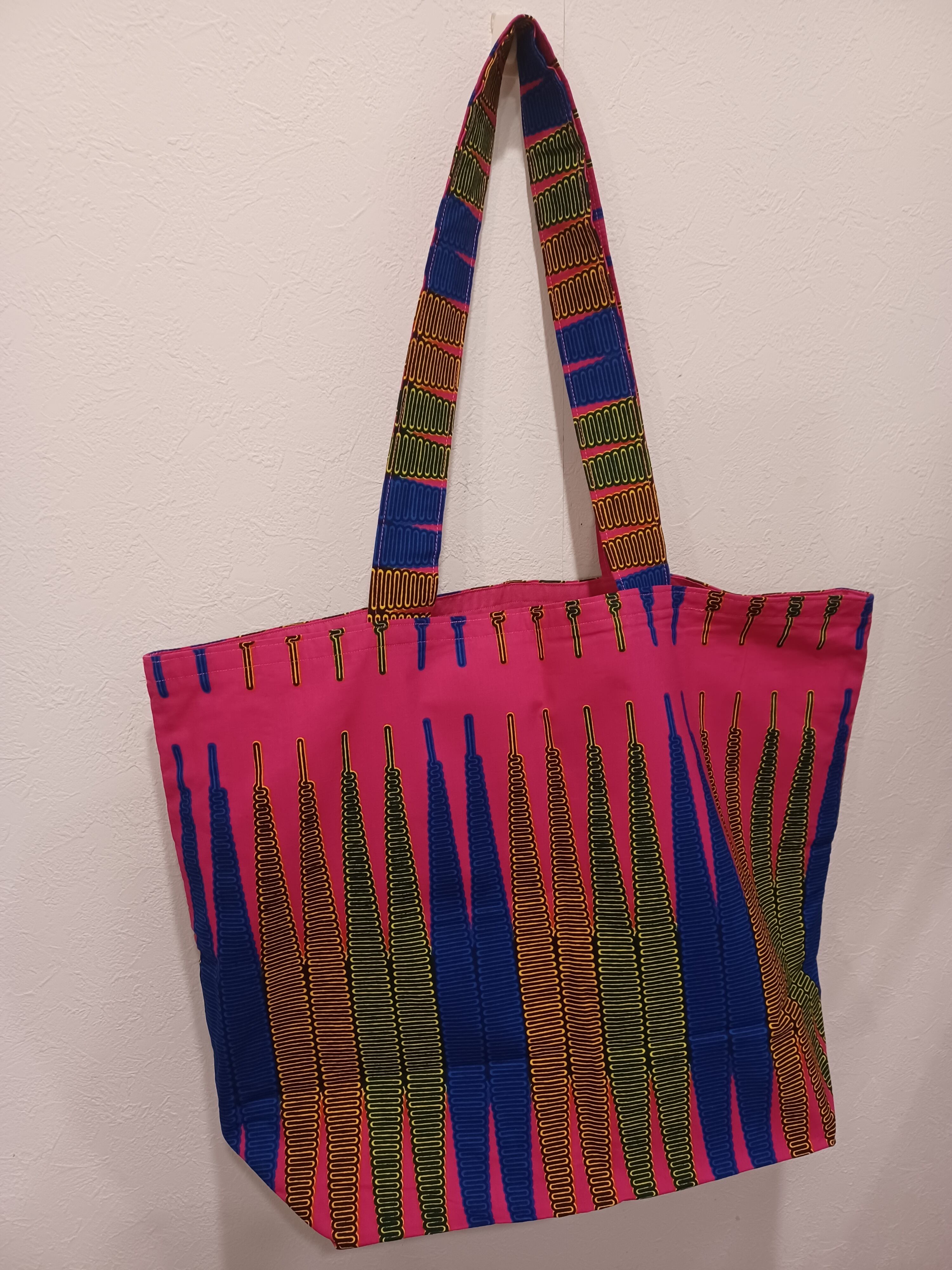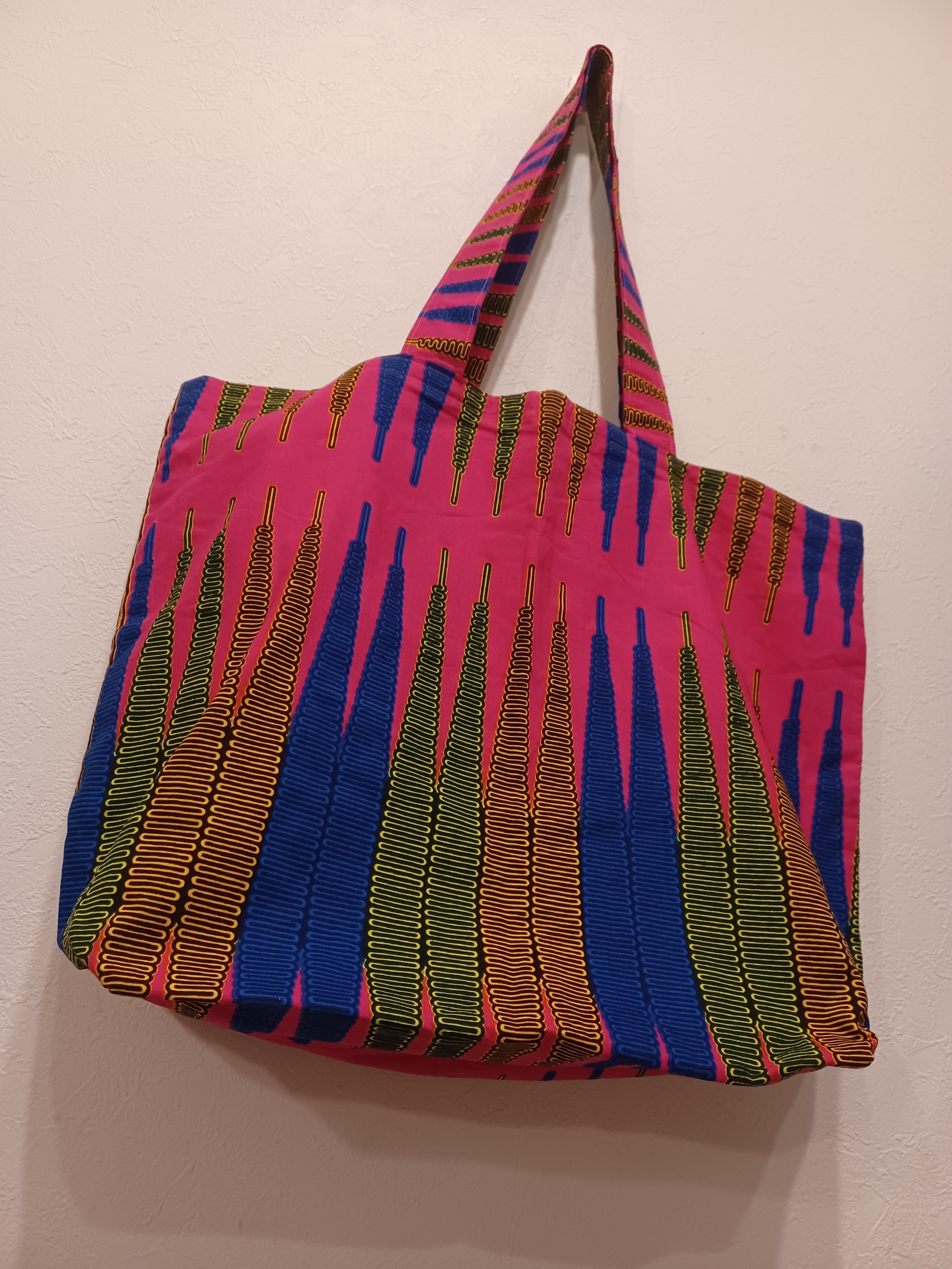 アフリカ布で作りました大容量のお買い物バックです。持ち手の長さが64cmあるのでたっぷり荷物をいれて肩にかけられます。